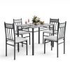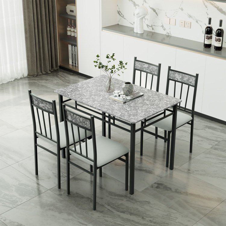 Modern style dining table set adds elegance and generosity to the roomThe solid steel frame ensures durable structure and long life spanScratch-resistant veneer tabletop; smooth and easy to cleanSpacious marble textured surface; place a large number of itemsThickly upholstered seat cushion enhances more comfortBreathable and skin-friendly fabric for a better sense of touchErgonomic backrest supports your back comfortablyFootpads protect the floor from scratching and reduce noiseSuitable for dining room; kitchen; restaurant; bistro; office; etc.Easy to assemble; save time to do more thing